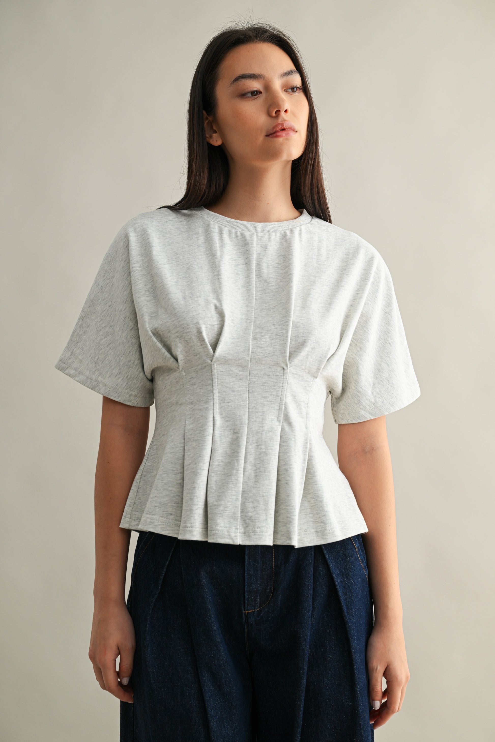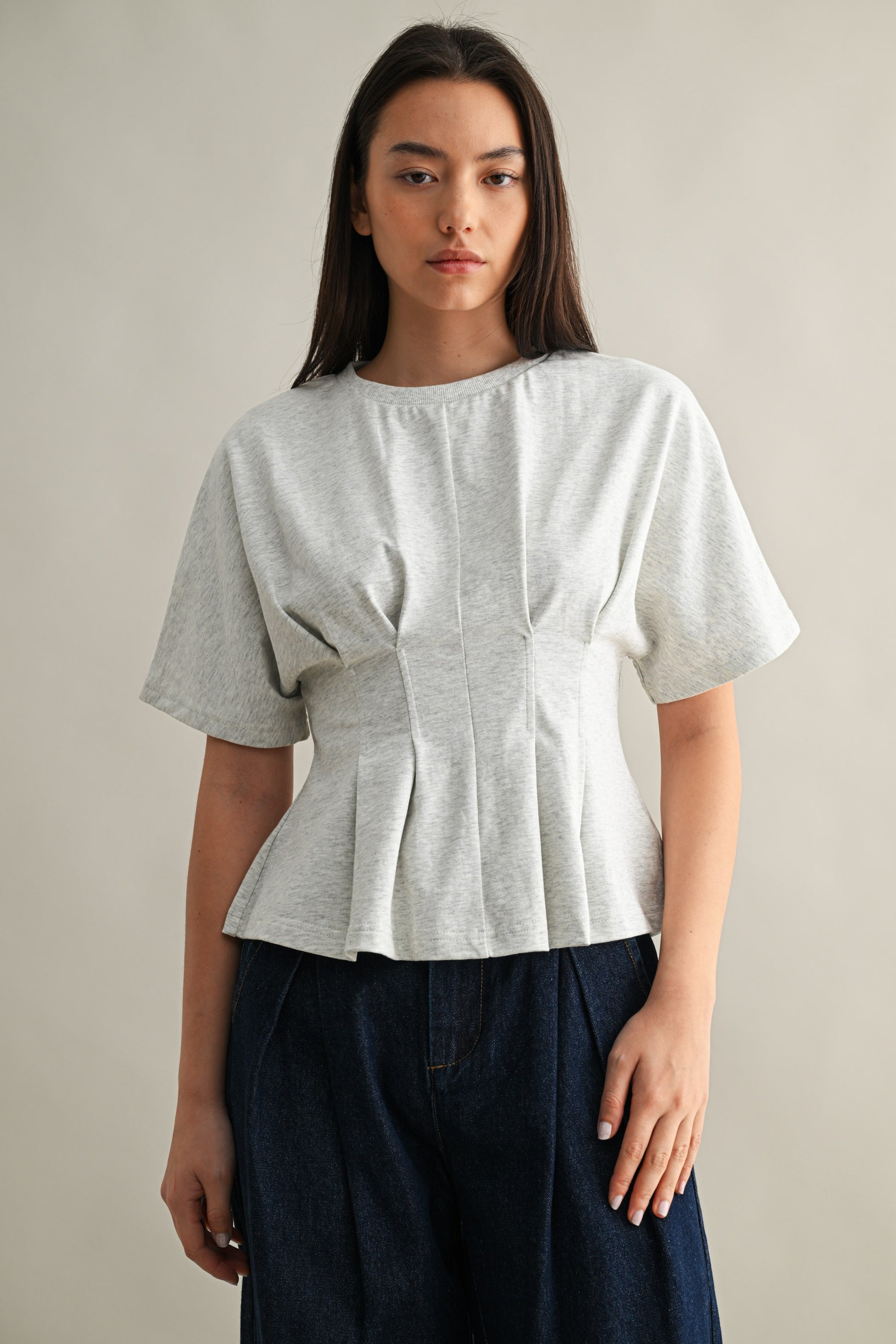 The Averie Pleated Top is your new go-to for effortless style. Crafted with delicate pleating throughout, this round neck essential brings texture and dimension to any outfit. Perfect for layering or wearing solo, it's the kind of piece that feels as good as it looks. Dress it up with tailored trousers or keep it casual with your favorite jeans—this versatile grey top does it all with understated charm.