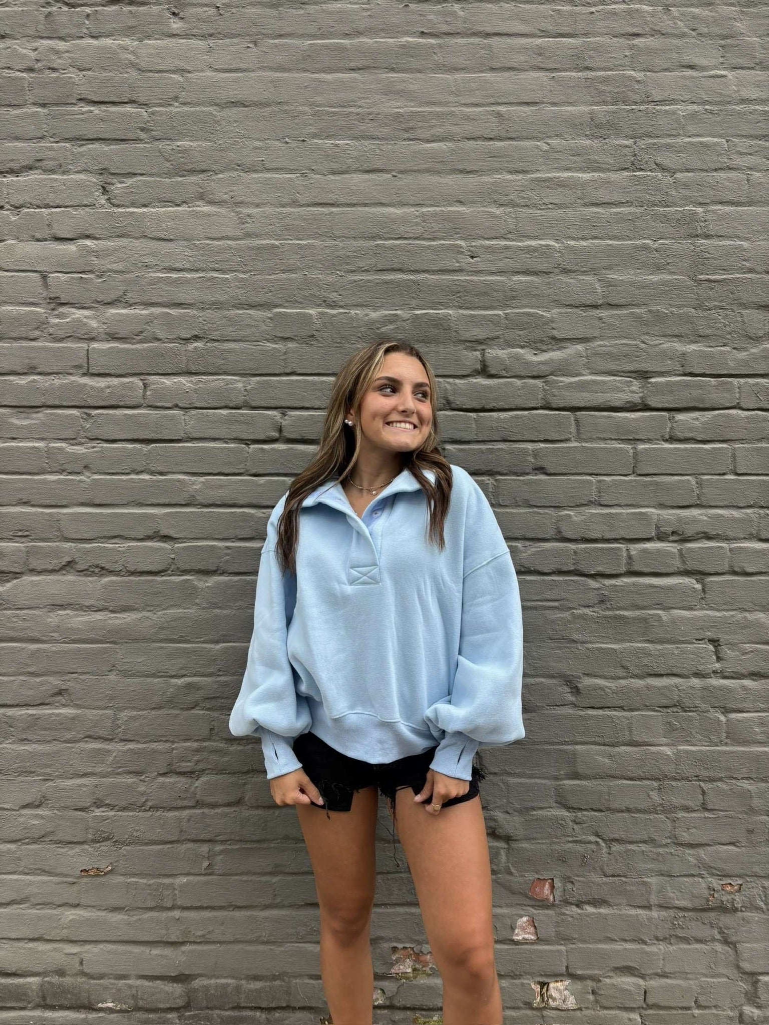 Stay cozy and stylish in the Saylor Quarter Snap sweatshirt, featuring playful thumb hole detailing for extra comfort and flair. Its light blue hue adds a fresh pop of color, perfect for layering or lounging. This sweatshirt combines casual ease with a fun twist to brighten your everyday look.